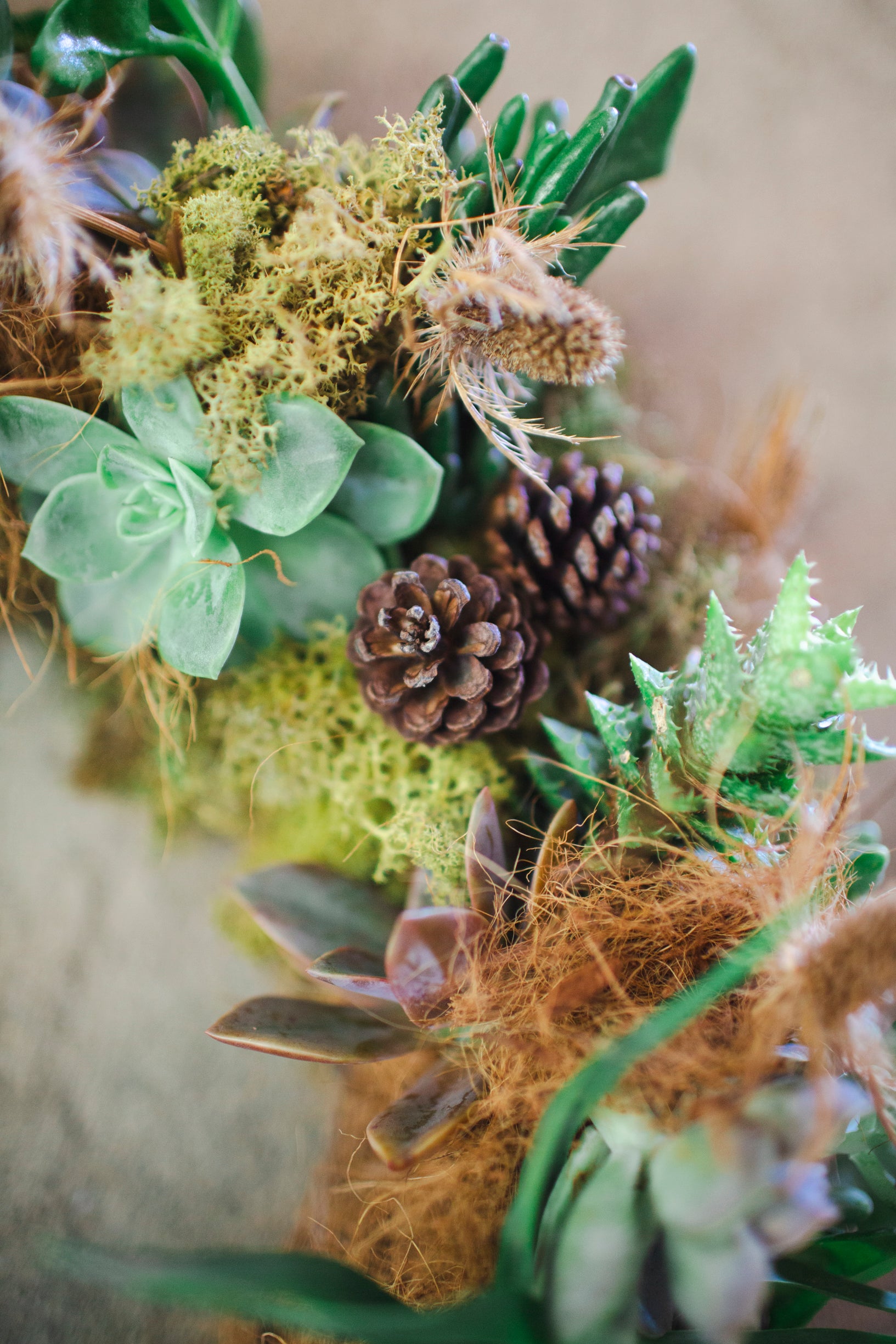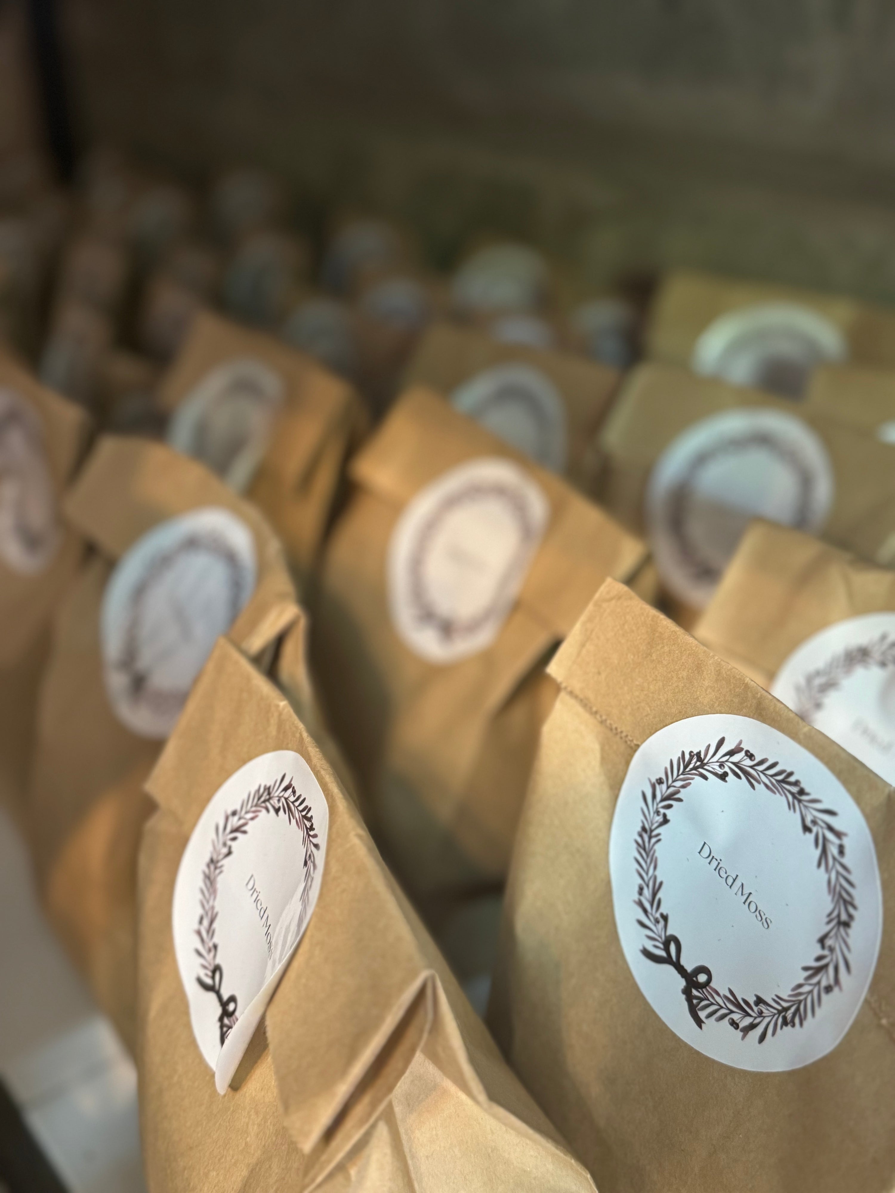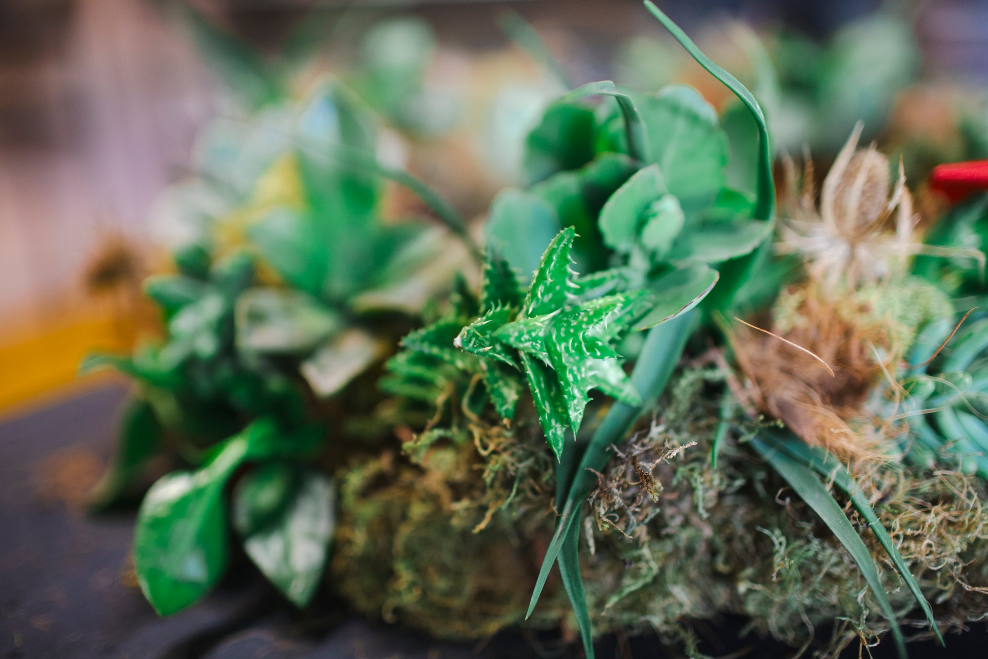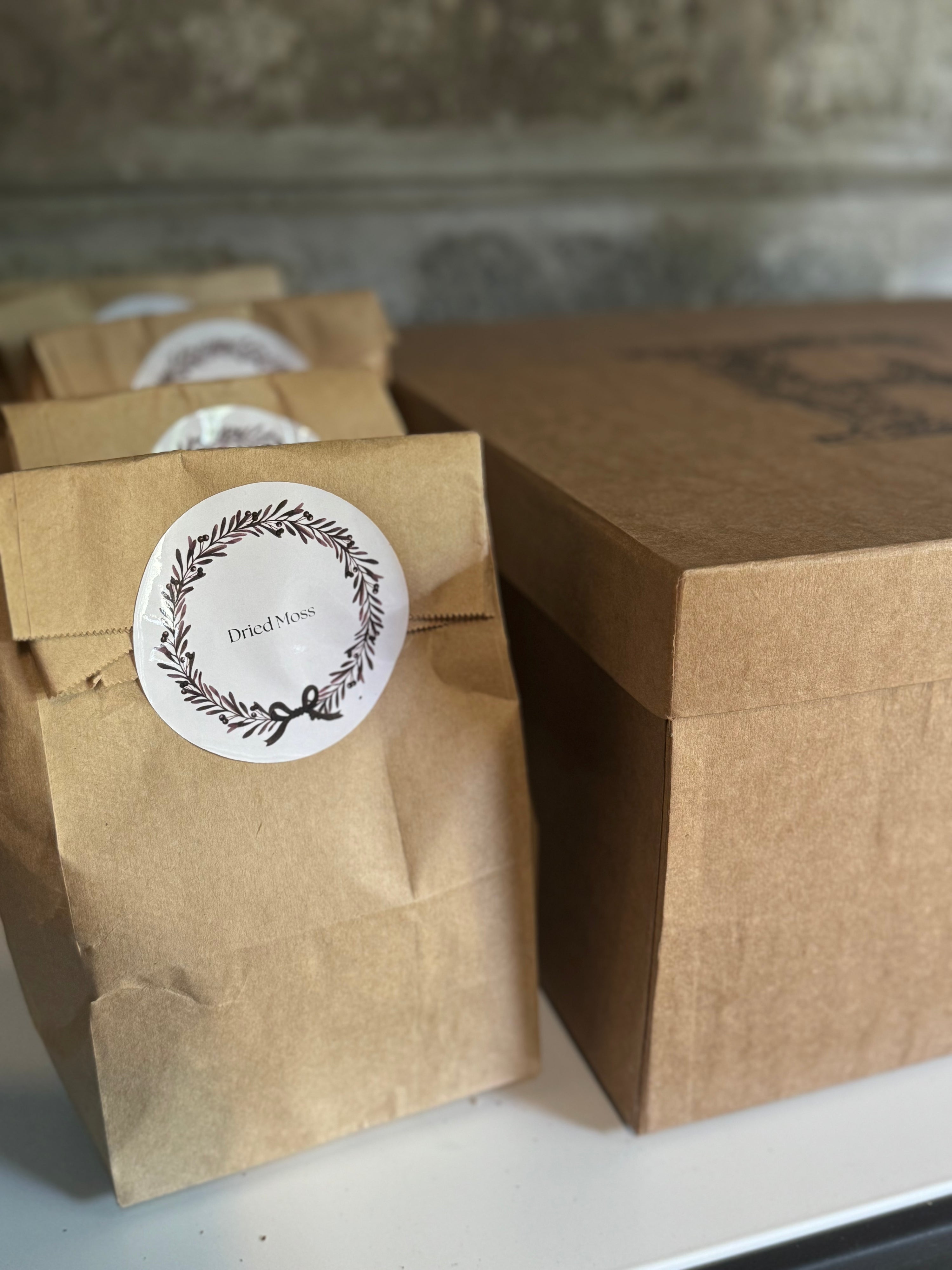 10” oasis wreath, mossing pins, wire, pair of disposable gloves, ribbon, coir, preserved moss, dried moss, succulents, aloes. Packaged in a box, ready for delivery or gifting.