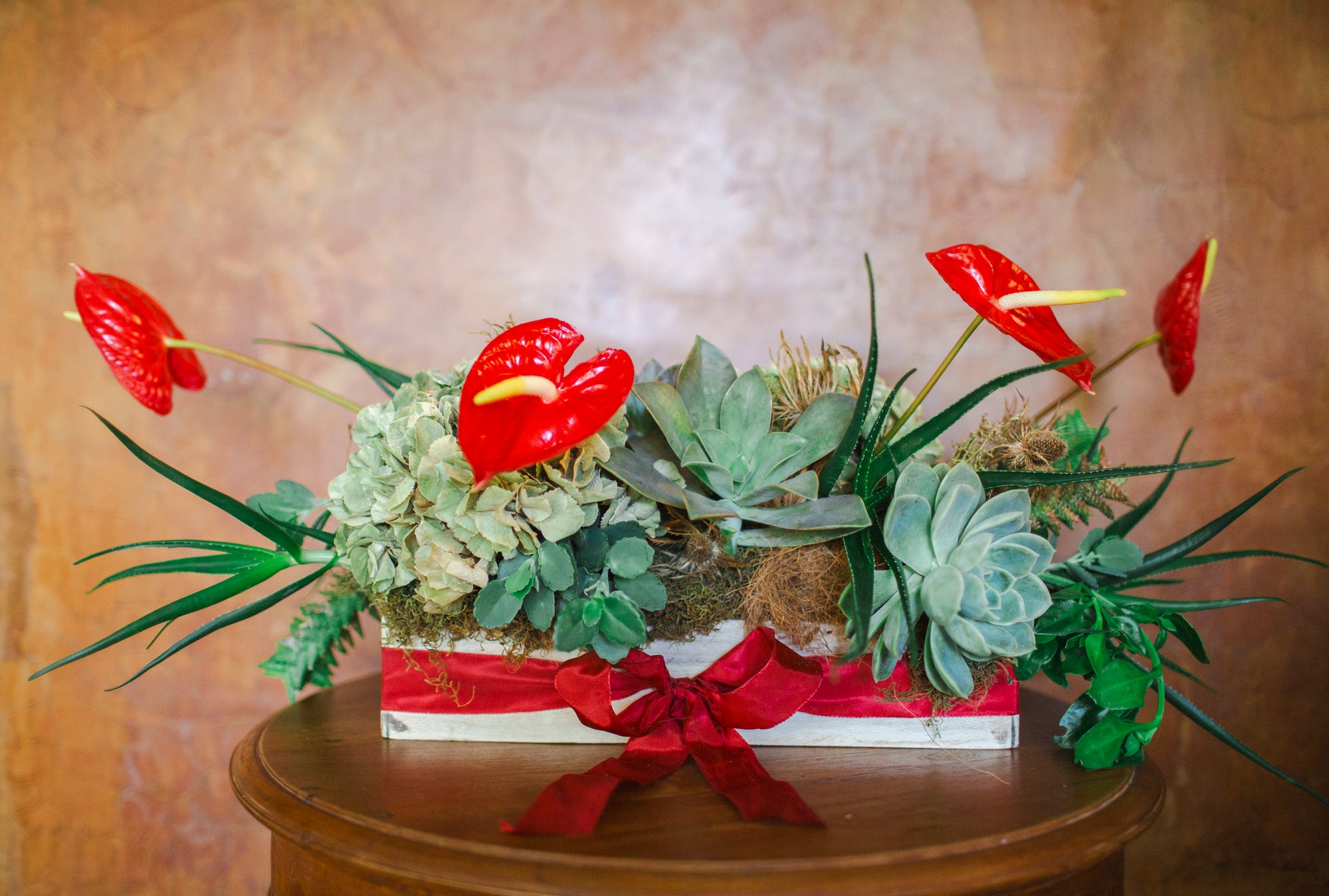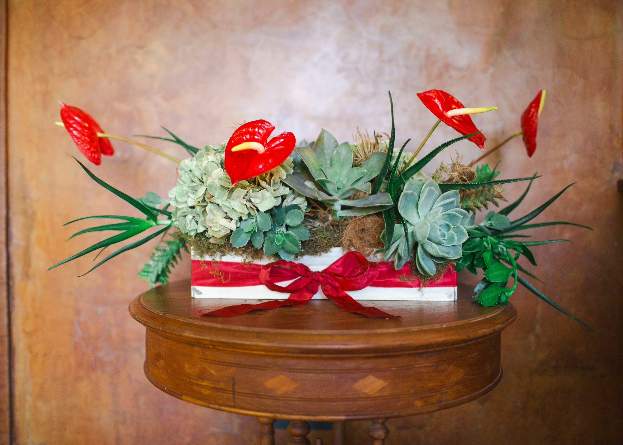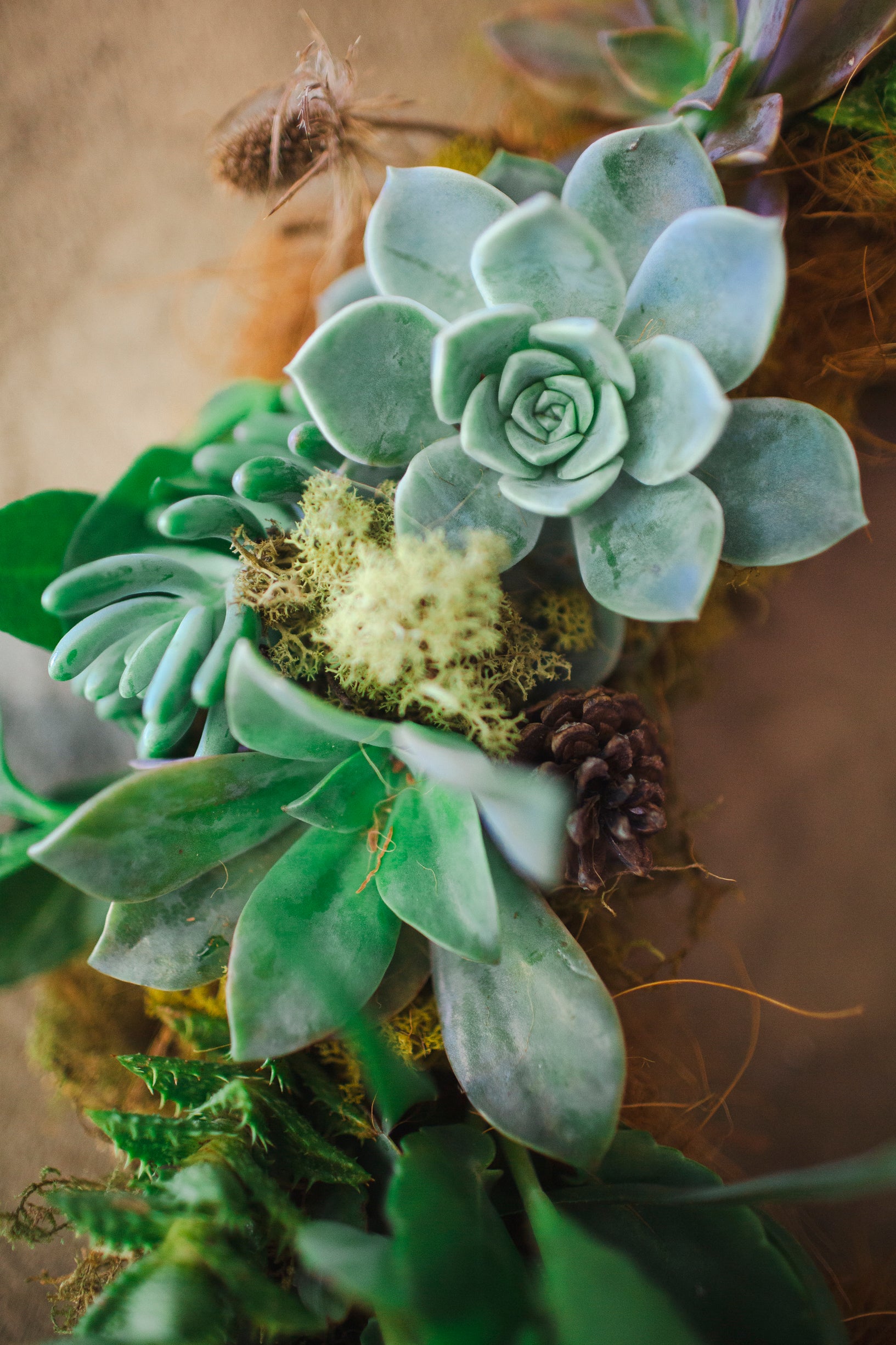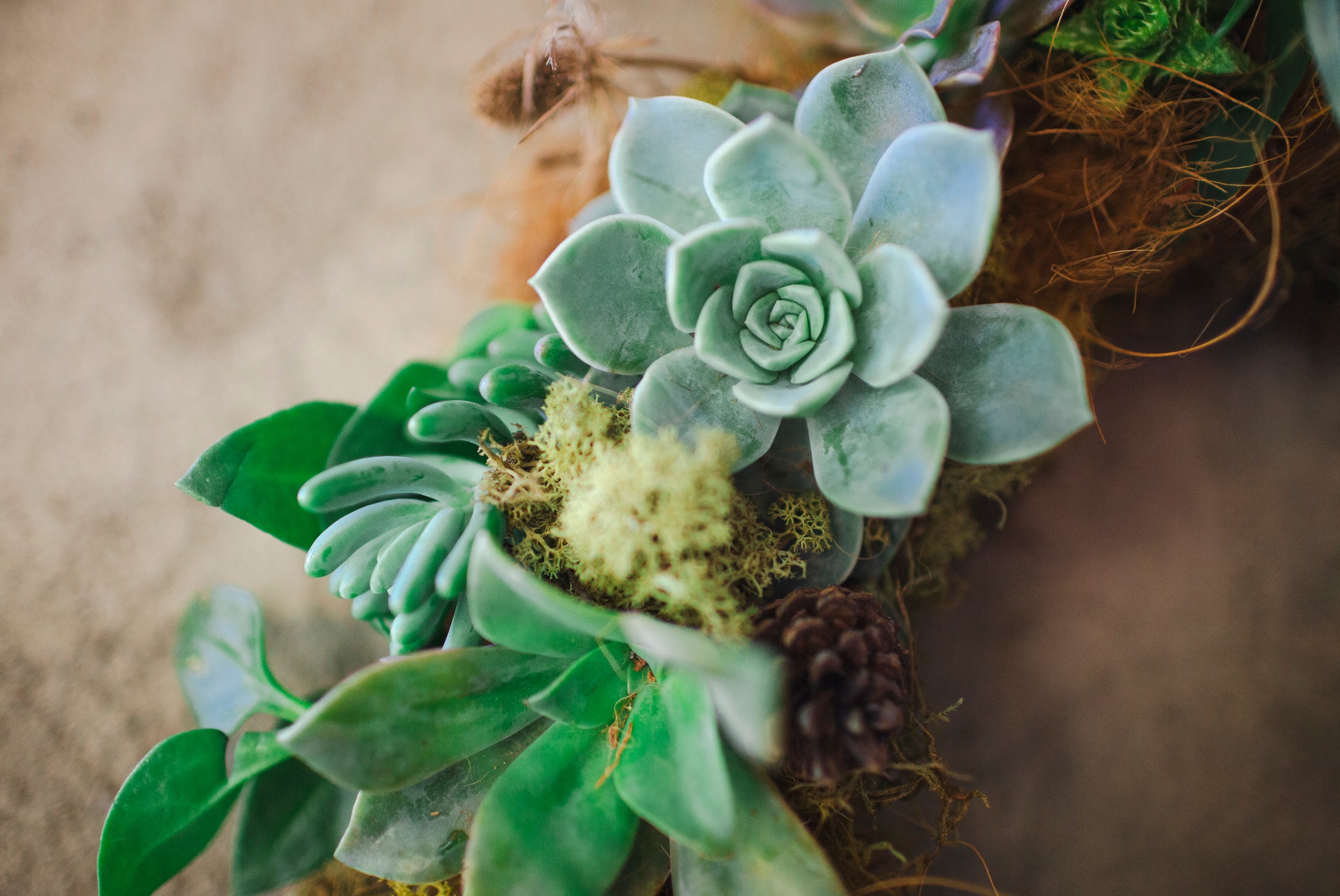 10” oasis wreath, mossing pins, wire, pair of disposable gloves, ribbon, coir, preserved moss, dried moss, succulents, aloes. Packaged in a box, ready for delivery or gifting.