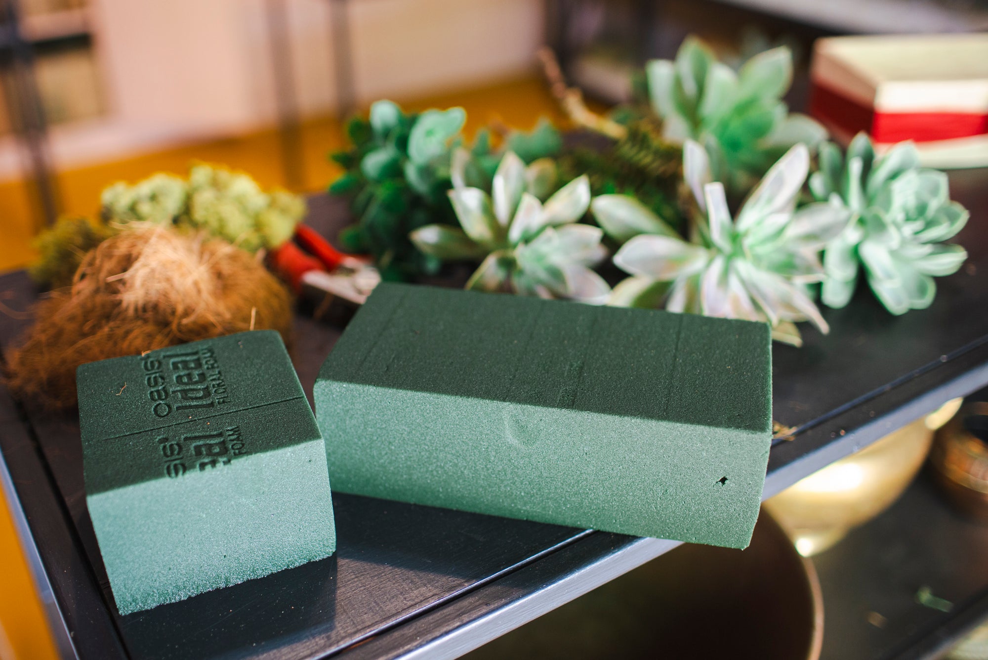 14” oasis wreath, mossing pins, wire, pair of disposable gloves, ribbon, coir, preserved moss, dried moss, succulents, aloes. Packaged in a box and ready for delivery.